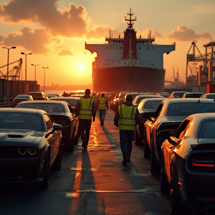 Autoexport 2026 – Internationale Fahrzeuglogistik. Gebrauchtwagen werden in einem Hafen auf ein Frachtschiff verladen, Symbol für globalen Autoexport 2026. Ein logistisches Hafenszenario mit mehreren Gebrauchtwagen, die für den Export vorbereitet werden. Das Bild zeigt die internationale Bedeutung des Autoexports im Jahr 2026.